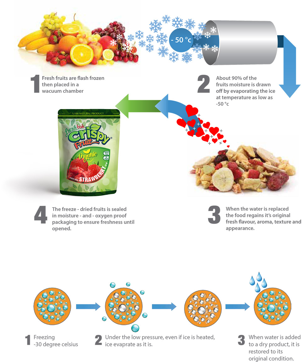 Freeze-drying is a process where frozen raw materials are placed in a refrigerated vacuum and ice crystals in the product are sublimated into water vapour, while the cell structure of the original product remains. The freeze-dried product also retains the color, shape, flavor and nutritional value of the original raw material better than other drying methods